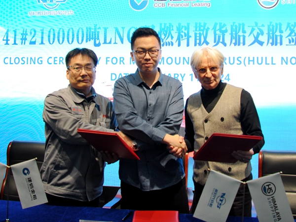 On January 11, 2024, the closing ceremony for 41# 210,000 DWT Bulk Carrier with Builder's Hull No.0120841 was held at the meeting room on 8th floor of New Times Office Building. The representatives from the Owner and the representatives from CCB Financial Leasing Co., Ltd. were present. Our Executive Deputy General Manager Mr. Zhang Yuyong,  Site Manager Mr. Davor Radic and Manager of Ship Leasing Dept. of CCB Financial Leasing Co., Ltd. Mr. Zhang Haocong signed the delivery documents. The vessel was smoothly and successfully delivered by us and accepted by the Owner.