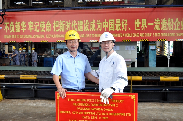 On September 11, 2020 , the Steel Cutting Ceremony of two units of 50,000 DWT Product Oil/Chemical Tankers (IMO Type 2) with Hull Nos.0405026 and 0405027 has been carried out successfully by New Times Shipbuilding Co., Ltd. Our CEO Mr. Liu Haijin and representatives from the owner, DNV-GL Class and CCS Class attended and witnessed the ceremony together.