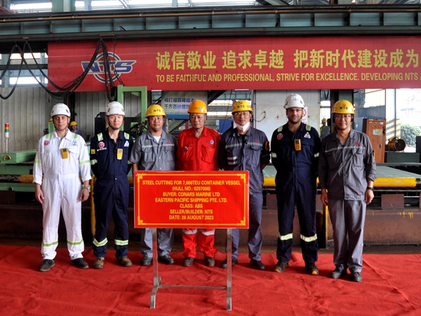On August 28, 2023, the steel cutting of one 7000TEU Container Vessel bearing builder's hull no.0207006 has been carried out successfully by New Times Shipbuilding Co., Ltd.. Our Manager of Production Dept. Mr. Chen Yuefeng, the representatives from the Owner EPS and ABS Classification Society attended and witnessed this event.