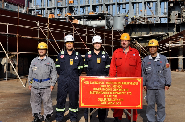 On October 31, 2023, the keel laying of one 7000 TEU Container Vessel bearing builder's hull no.0207004 has been carried out successfully by New Times Shipbuilding Co., Ltd.. The representatives from EPS Site Team and ABS classification society attended and witnessed this event.