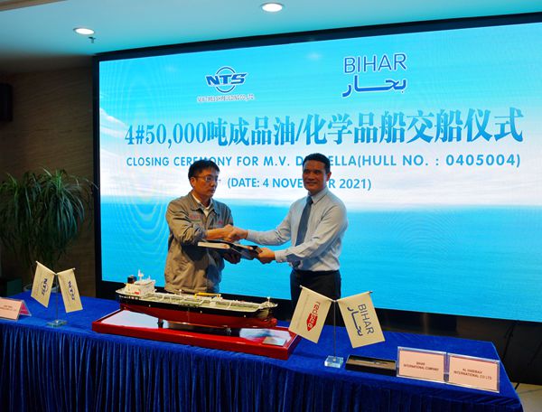 On 4 November 2021, the closing ceremony for 4# 50,000 DWT Product Oil/Chemical Tanker was held at the meeting room on 8th floor of New Times Office Building. Our CEO Mr. Liu Haijin, Executive Deputy General Manager Mr. Zhang Yuyong, VP & Executive Director Mr. Yuan Heng and owner's representative were present, and the members from owner's head office also witnessed this ceremony through video. The vessel was smoothly and successfully delivered by us and accepted by the Owner.