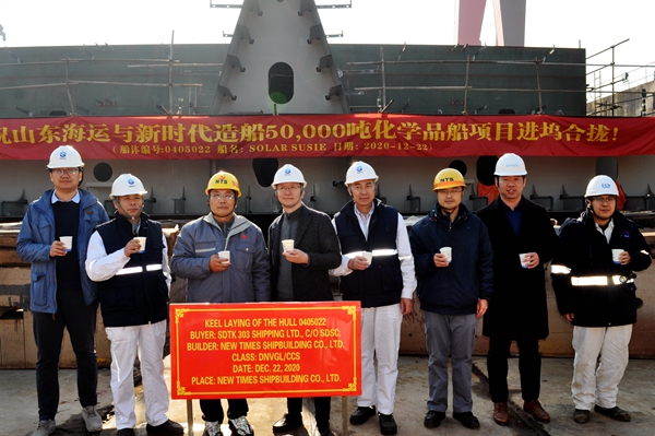 On December 22, 2020, the Keel Laying Ceremony of No.22 & 23 50,000 DWT Product Oil/Chemical Tankers was carried out successfully by New Times Shipbuilding Co., Ltd. Our Executive General Manger Mr. Zhang Yuyong, Deputy General Manger Mr. Zhu Hangang, representatives from the owner Shandong Shipping Corporation and representatives from the classification societies DNV-GL and CCS attended and witnessed the ceremony together.