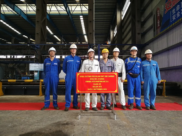 On September 2, 2019, the steel cutting of No.4 325,000 DWT Ore Carrier has been carried out successfully by New Times Shipbuilding Co., Ltd.. Our Deputy General Manger Mr. Zhu Hangang and representatives from the owner Pan Ocean and KR classification society attended this event.