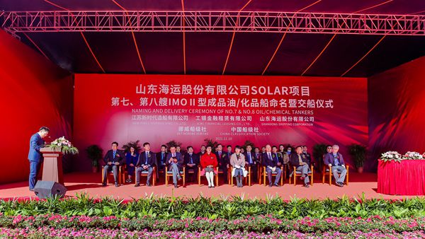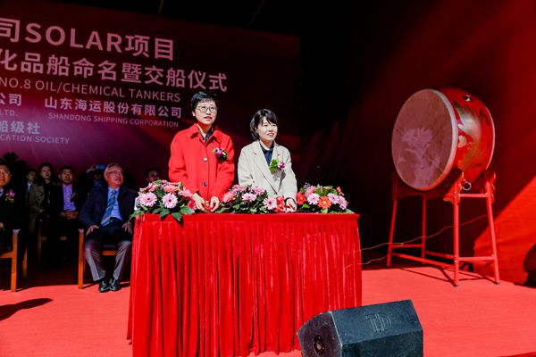 On November 9 and November 10, 2021, the closing ceremony for 26# and 27# 50,000 DWT Product Oil/Chemical Tanker (IMO II Type) was held respectively at the meeting room on 8th floor of New Times Office Building. Our CEO Mr.Liu Haijin, Executive Deputy General Manager Mr. Zhang Yuyong, Deputy General Manager Mr. Yuan Heng, Vice General Manager Mr. Xu Tao of Shandong Shipping Corporation and the representive from ICBC Financial Leasing Co., Ltd. attended this ceremony. The vessels were smoothly and successfully delivered by us and accepted by the Owner. On November 10, Godmother Mrs. He Li named the vessel bearing Hull No.0405026 for "Ruo Yun", Godmother Mrs. Xu Li named the vessel bearing Hull No.0405027 for "Karen".