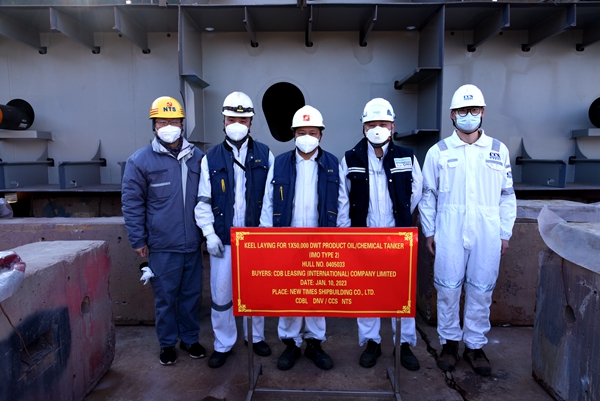 On January 10, 2023, the Keel Laying Ceremony of one 50,000 DWT Product Oil/Chemical Tanker (IMO Type 2) with Hull No.0405033 has been carried out successfully by New Times Shipbuilding Co., Ltd. The representatives from the owner CDB Leasing (International) Co., Ltd. and representatives from the classification societies DNV and CCS attended and witnessed the ceremony together.