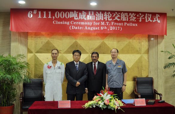 On August 8, the closing ceremony for No.6 111,000 DWT Oil Tanker was held at the meeting room on 8th floor of New Times Office Building. Our CEO Mr. Liu Haijin, Executive General Manger Mr. Zhang Yuyong and representatives from Owner Frontline attended this ceremony. The delivery documents for this ship were successfully signed by both parties.