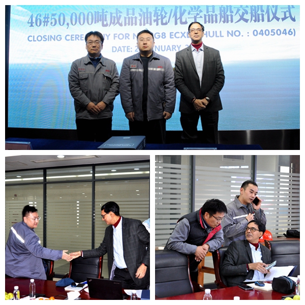 On January 24, 2024, the closing ceremony for 46# 50,000 DWT Product Oil/Chemical Tanker with Hull No.0405046 was held at the meeting room on 8th floor of New Times Office Building. Our Executive Deputy General Mananger Mr. Zhang Yuyong, Deputy General Manager & Executive Director Mr. Yuan Heng  and the Qwner's Site  Manager Mr. Kumar were present. The vessel was smoothly and successfully delivered by us and accepted by the Owner.