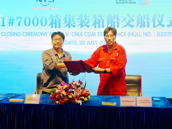 On July 20, 2023, the closing ceremony for 1# 7000 TEU Container Vessel with Builder's Hull No.0207001 was held at the meeting room on 8th floor of New Times Office Building. Our CEO Mr. Liu Haijin, Executive Deputy General Manager Mr. Zhang Yuyong, Deputy General Manager & Executive Director Mr. Yuan Heng and owner's representative were present. The vessel was smoothly and successfully delivered by us and accepted by the Owner.