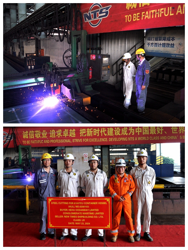 On May 23, 2024, the steel cutting of two units of 8100 TEU Container Vessels bearing builder's hull nos.0208103 and 0208109 has been carried out successfully by New Times Shipbuilding Co., Ltd.. The representatives from shipyard, the Owner CONGLOMERATE MARITIME LIMITED together with the representatives from LR and BV classification societies attended and witnessed this event.