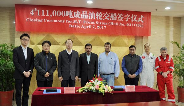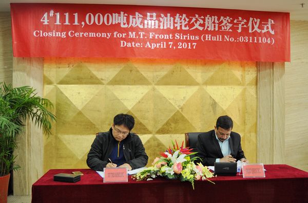 On April 7, the closing ceremony for No.4 111,000 DWT Oil Tanker was held at the meeting room on 8th floor of New Times Office Building. Our CEO Mr. Liu Haijin, Executive General Manger Mr. Zhang Yuyong and representatives from Owner Frontline attended this ceremony. The delivery documents for this ship were successfully signed by both parties.