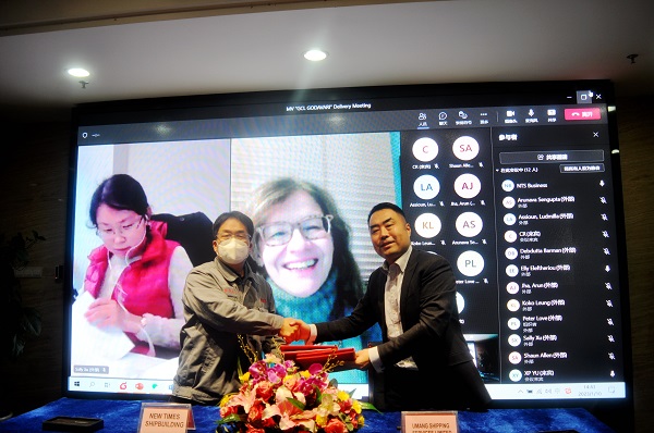 On January 10, 2023, the closing ceremony for 1# 120,000 DWT Bulk Carrier with Hull No.0112001 was held at the meeting room on 8th floor of New Times Office Building. Our CEO Mr. Liu Haijin, Executive Deputy General Manager Mr. Zhang Yuyong, Deputy General Manager & Executive Director Mr. Yuan Heng  and owner's representative were present. The vessel was smoothly and successfully delivered by us and accepted by the Owner.