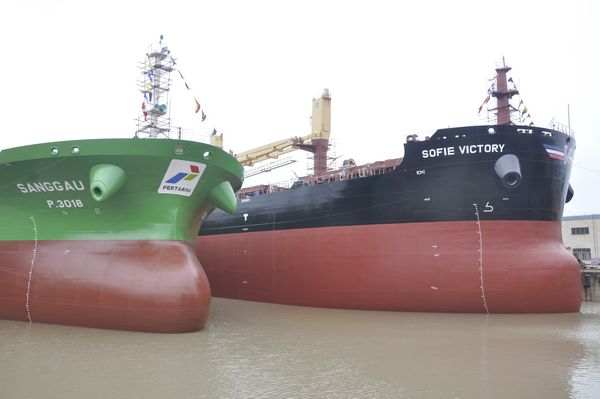 Via deliberate management and dedicated working spirit from all company staff, , five ships launched successfully in October, which were No.1 and No.2 180,000 dwt bulk carriers, No.1 40,000 LTDW Crude Oil Tanker, No.6 64,000 DWT Bulk Carrier and No.5 58,500 DWT Bulk Carrier respectively.(Pictured here is launch of No.1 40,000 LTDW Crude Oil Tanker and No.6 64,000 DWT Bulk Carrier at the same time.)