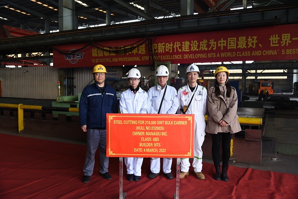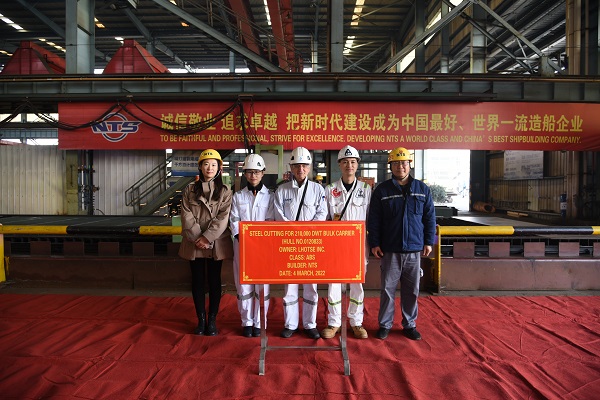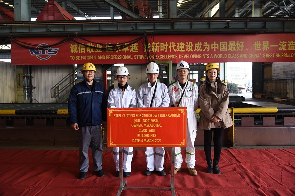 On March 4, 2022, the Steel Cutting Ceremony of three units of 210,000 DWT LNG DUAL FUEL Bulk Carriers with  Hull Nos.0120833/34/35 has been carried out successfully by New Times Shipbuilding Co., Ltd. Our Production Manager Mr. Chen Yuefeng, the representatives from the owner Himalaya Shipping Ltd. and representatives from the classification societies ABS attended and witnessed the ceremony together.