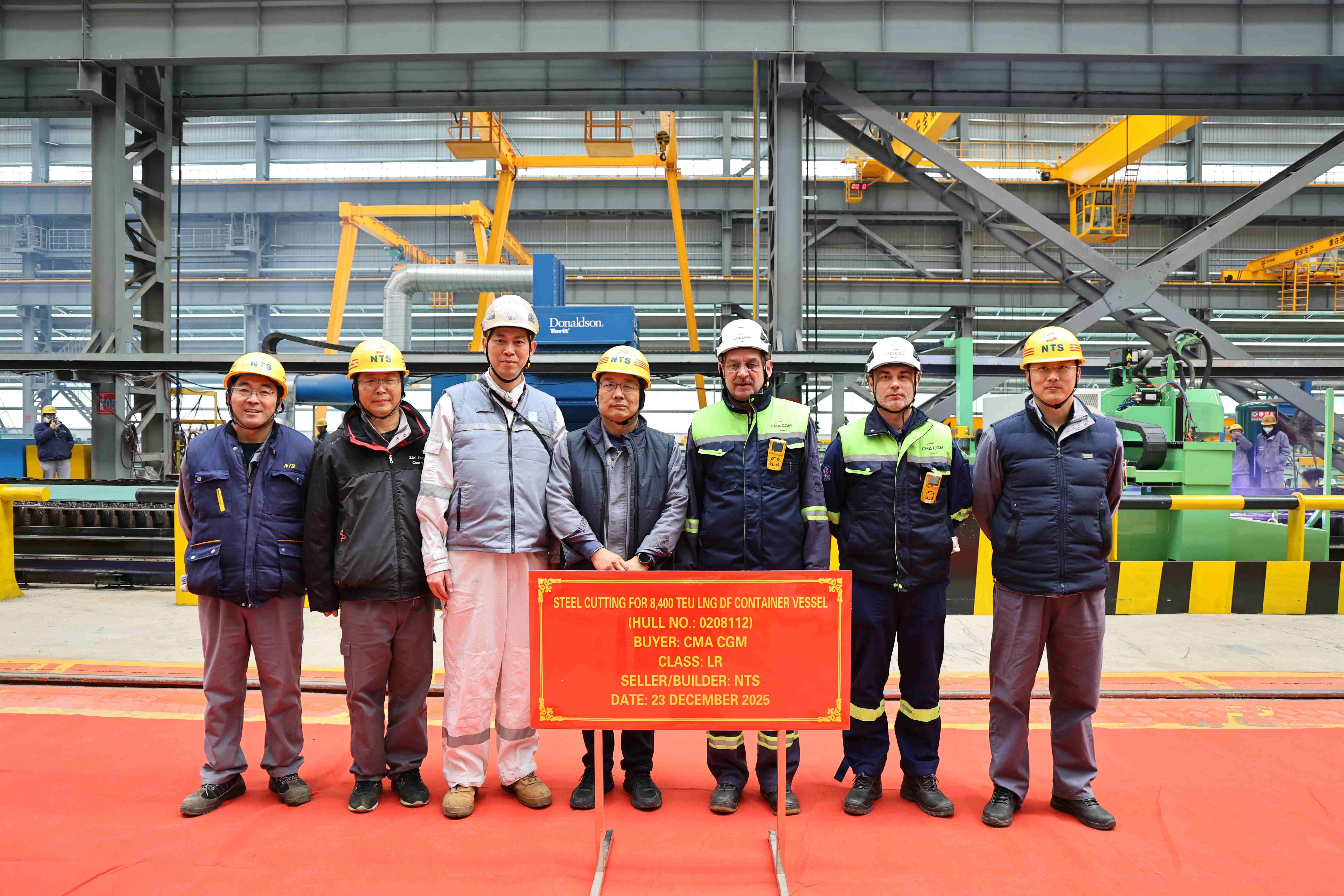 On December 23, 2025, the steel cutting of one 8400 TEU LNG Dual Fuel Container Vessel bearing builder's hull no.0208112 was carried out successfully by New Times Shipbuilding Co., Ltd.. The representatives from shipyard, CMA CGM Site Team and LR classification society attended and witnessed this event.