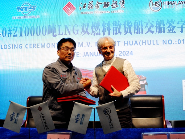 On January 8, 2024, the closing ceremony for 40# 210,000 DWT Bulk Carrier with Builder's Hull No.0120840 was held at the meeting room on 8th floor of New Times Office Building. Our Executive Deputy General Manager Mr. Zhang Yuyong, Deputy General Manager & Executive Director Mr. Yuan Heng and the owner's representative were present. The vessel was smoothly and successfully delivered by us and accepted by the Owner.