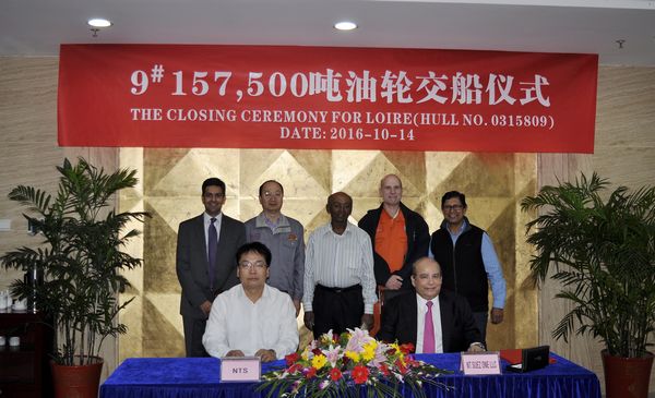 On Oct. 14th, 2016, the closing ceremony for No.9 157,500 Oil Tanker was successfully held at the meeting room on 8th floor of NTS Office Building, and relevant delivery documents were signed by Executive Deputy General Manger Mr. Zhang Yuyong and representatives from the Contracted Buyer, TRF.
