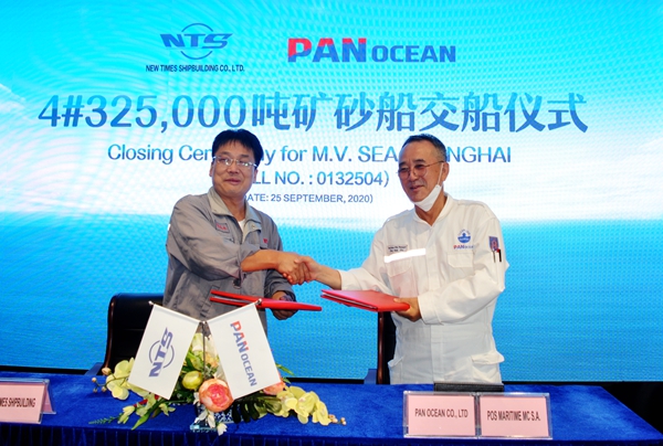 On September 25, 2020, the closing ceremony for 4# 325,000 DWT Ore Carrier was held at the meeting room on 8th floor of New Times Office Building. Our CEO Mr.Liu Haijin, Executive General Manger Mr. Zhang Yuyong, the representive from Pan Ocean Mr. Nak Jin Choi attended this ceremony. The vessel was smoothly and successfully delivered by us and accepted by Pan Ocean.