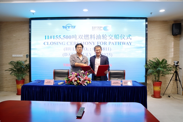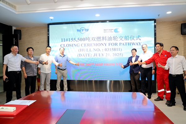 On July 21, 2025, the closing ceremony for 11# 155,500 DWT LNG Dual Fuel Crude Oil Tanker bearing Hull No.0315811 was held at the meeting room on 8th floor of New Times Office Building. The ceremony was attended by the company's Chief Executive Officer Mr. Liu Haijin, Executive Deputy General Manager Mr. Zhang Yuyong, together with distinguished guests, including EPS Commercial Director Mr. Tay Gak Yong, New Building and Projects - Manager Mr. Manoj Wadhwani and Site Manager Mr. Ni Jie. The delivery documents were jointly signed by Mr. Zhang Yuyong and Mr. Tay Gak Yong. The vessel was smoothly and successfully delivered by us and accepted by the Owner EPS, marking the milestone of the 500th 10,000-ton vessel delivered in the company's history.