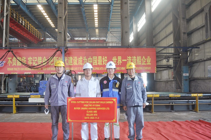 On November 3, 2022,  the steel cutting of one unit of 120,000 DWT Bulk Carrier bearing builder's hull no. 0112004 has commenced. Our Head of Production Department Mr. Chen Yuefeng, QC Manager Mr. Qin Feng, representatives from MITTAL site office Mr. Sun Jinfeng and representatives from ABS classification society attended and witnessed this event.