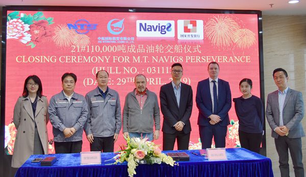 On April 29, 2019, the closing ceremony for 21# 110,000 DWT Product Oil Tanker was held at the meeting room on 8th floor of New Times Office Building. Our CEO Mr. Liu Haijin, Executive General Manger Mr. Zhang Yuyong and the representatives from AVIC, Navig8 and China Development Bank attended this ceremony. The vessel was smoothly and successfully delivered by us and accepted by the Buyer.