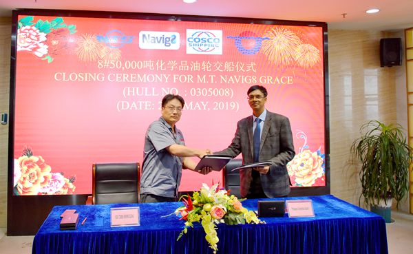 On May 20, 2019, the closing ceremony for 8# 50,000 DWT Product Oil/ Chemical Tanker was held at the meeting room on 8th floor of New Times Office Building. Our Executive General Manger Mr. Zhang Yuyong and the representative Mr.Binod Kumar from Navig8 attended this ceremony. The vessel was smoothly and successfully delivered by us and accepted by the Buyer.