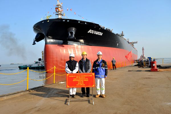 11#110000噸油船的船東沙特是BIHAR INTERNATIONAL COMPANY,在我們企業(yè)司共訂制了4艘110000噸油船和2艘50000噸化學(xué)品/油船,目前己交付2艘110000噸油船和2艘50000噸化學(xué)品/油船,此次下水的是110000噸系列油船的第3艘船舶。