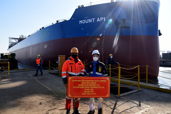 12月18日中午,公司3#塢區(qū)域,35#46#210000噸雙燃料動力散貨船兩船相繼駛出船塢,下水大節(jié)點順利實現(xiàn),標(biāo)志著公司全年下水船舶23艘計366.4萬載重噸的目標(biāo)完美收官。本次塢期42天,不僅刷新了21萬噸雙燃料動力散貨船塢內(nèi)建造周期的最短紀(jì)錄,而且出塢完整性也取得了新突破。