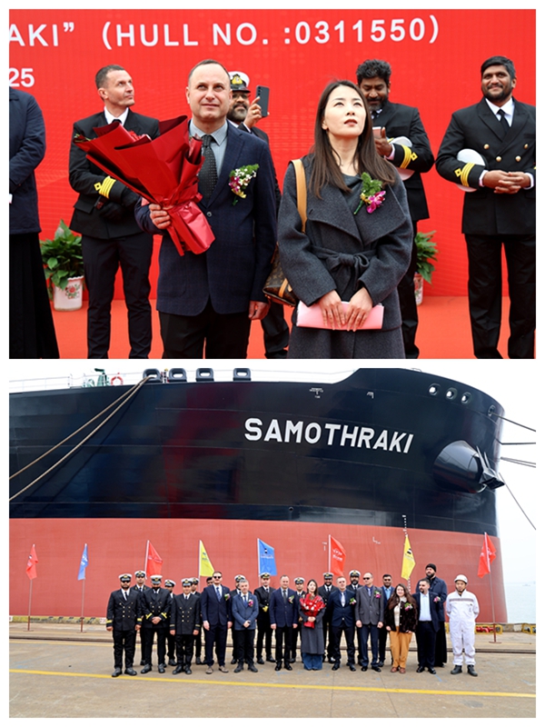 7日下午,公司又在東區(qū)碼頭為50#113500噸油船舉行命名儀式,常務(wù)副總經(jīng)理張玉永主持活動,希臘船東Dynacom公司代表Romeo Mustata等嘉賓出席。教母姜妍將這艘船命名為“SAMOTHRAKI”,祝愿它和伴它遠(yuǎn)航的人們一帆風(fēng)順,平安如意,永遠(yuǎn)為船東帶來財富和好運。Dynacom公司共訂購兩艘113500萬噸油船,該型船總長249.9米,型寬44米,型深21.5米,設(shè)計吃水13.6米,結(jié)構(gòu)吃水15.2米,艙容為130950cbm,載重113500噸,入BV船級社。