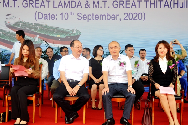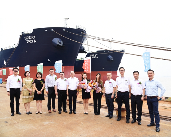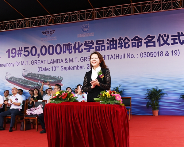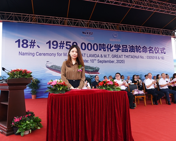 18#、19#50000噸化學品/油船的圣母顧梁羽女士和周文婧女士分別將兩艘船舶命名為“GREAT LAMDA”、“GREAT THITA”號,并祝愿兩艘新船與陪伴新船遠航的人們一帆風順、平安如意。