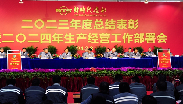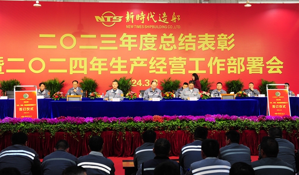 常務(wù)副總經(jīng)理張玉永主持大會(huì),他指出,2023年,我們?cè)诠径聲?huì)、黨委和經(jīng)營層的正確領(lǐng)導(dǎo)下,強(qiáng)管理,促生產(chǎn),交出了一份含金量滿滿的答卷。今天我們新時(shí)代造船人隆重舉行“二〇二三年度總結(jié)表彰暨二〇二四年生產(chǎn)經(jīng)營工作部署會(huì)”,主要目的是總結(jié)2023年工作,表彰先進(jìn)典型;部署2024年任務(wù),動(dòng)員公司上下樹立榜樣力量,以嶄新的姿態(tài)、飽滿的熱情、務(wù)實(shí)的作風(fēng),接續(xù)奮斗、奮勇前行,全面提升公司各項(xiàng)管理工作,奮力譜寫新時(shí)代高質(zhì)量發(fā)展新篇章,把新時(shí)代造船打造成世界一流的百年造船企業(yè)。