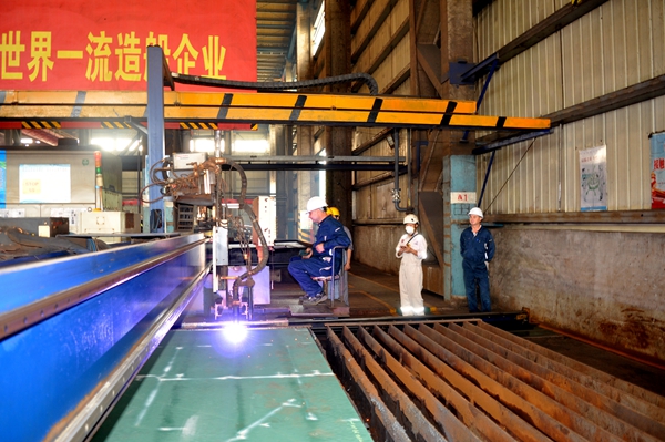 9月10日上午,1#295000噸油船開工點(diǎn)火儀式在東區(qū)鋼加車間舉行,總經(jīng)理助理徐震宇與希臘船東Dynacom代表等出席活動,共同啟動等離子切割機(jī)點(diǎn)火按鈕,船體結(jié)構(gòu)件開始預(yù)制。