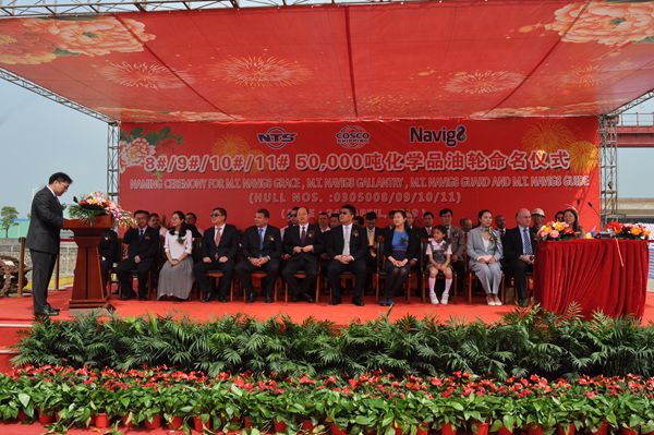 4月24日,公司隆重舉行船舶命名慶典儀式,為新建造的8#、9#、10#、11#50000噸等四艘化學(xué)品油船命名,迎來了新的生產(chǎn)高潮?偨(jīng)理劉海金、常務(wù)副總經(jīng)理張玉永、副總經(jīng)理朱韓鋼、總經(jīng)理助理徐震宇與中遠(yuǎn)海運發(fā)展有限公司副總經(jīng)理蘇光、船東Navig8集團Gary Brocklesby主席、韓國KR船級社代表等嘉賓一起出席活動,儀式由常務(wù)副總經(jīng)理張玉永主持。