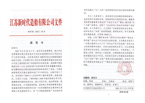 當(dāng)前,正值“驥洋食品杯”夏季百日安全賽和“保安全、迎華誕”安全生產(chǎn)百日攻堅(jiān)行動的開展,公司號召全體員工:一定要以董事長6月2日“安全生產(chǎn)百日攻堅(jiān)戰(zhàn)”動員大會上的講話精神為指針,自覺向孟秋艷同志學(xué)習(xí),認(rèn)認(rèn)真真落實(shí)好崗位安全責(zé)任,堅(jiān)決做到不傷害自己、不傷害他人、不被他人傷害、保護(hù)他人不被傷害,在確保絕對安全的前提下優(yōu)質(zhì)高效完成生產(chǎn)任務(wù),用實(shí)際行動和工作績效來體現(xiàn)我們 “以廠為家”“愛廠如家”那份至深至誠的情懷,共同為“打造中國最優(yōu)秀造船企業(yè)”“建設(shè)百年新時(shí)代”作出新的更大貢獻(xiàn)。