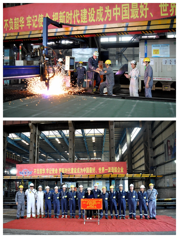 9:28,生產(chǎn)管理部、質(zhì)量部、營銷部等部門負責人又與希臘船東TMS代表出席49#115000噸油船點火開工儀式,該型油船總長249.9米,型寬44米,型深21.5米,設(shè)計吃水13.6米,結(jié)構(gòu)吃水15.2米,載重115800噸,入LR船級社,這是希臘船東TMS訂購的3艘115000噸油船中的第2艘船舶。