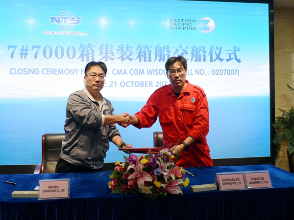 10月21日上午,公司舉行船舶簽字交付儀式,常務(wù)副總經(jīng)理張玉永與船東EPS公司代表倪杰共同簽署交船文本,7#7000箱集裝箱船完工交付船東運(yùn)營(yíng)。