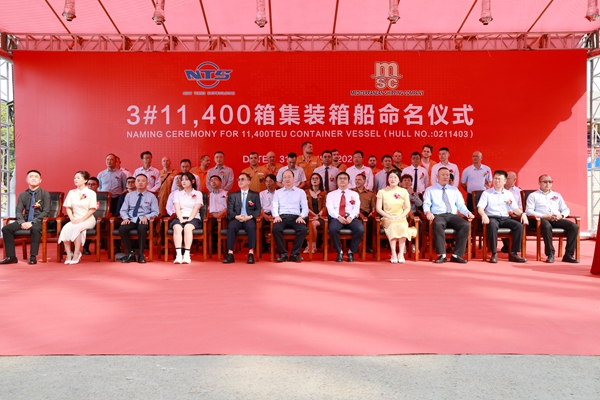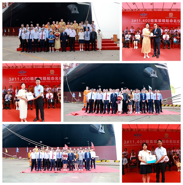 8月31日,公司隆重舉行船舶命名儀式,2#3#4#11400箱LNG雙燃料動力集裝箱船命名為“MSC  MUGE”“MSC  HORTENSE”“MSC  PROCIDA”號?偨(jīng)理劉海金、常務(wù)副總經(jīng)理張玉永、總經(jīng)理助理徐震宇與船東MSC代表、船級社代表等嘉賓出席命名儀式。