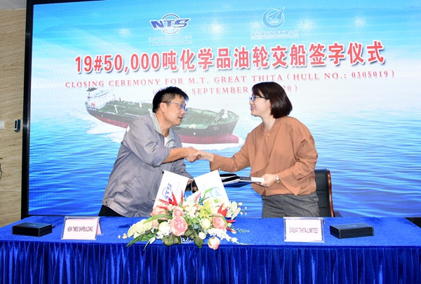9月28日下午,公司在八樓會(huì)議室舉行交船簽字儀式,公司總經(jīng)理劉海金、常務(wù)副總經(jīng)理張玉永與船東中航租賃代表一行出席儀式,共同見(jiàn)證常務(wù)副總經(jīng)理張玉永與船東中航租賃代表一起,為“GREAT THITA”號(hào)19# 50000噸化學(xué)品/油船交付簽字這一美好時(shí)刻。