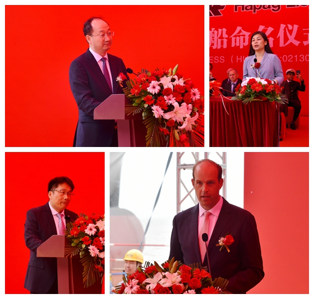 總經(jīng)理劉海金、常務副總經(jīng)理張玉永、副總經(jīng)理袁衡與船東赫伯羅特公司首席運營官Dr. Maximilian Rothkopf、船隊高級總監(jiān)Lutz-Michael Dyck、美的國際物流總經(jīng)理賓麗女士、 Anglo-Eastern首席運營官Carsten Ostenfeld、Chartworld航運公司新造船部經(jīng)理Spyros Papandreou、法國船級社新造船部中國區(qū)經(jīng)理Christophe Vaes等嘉賓出席活動。教母賓麗女士將新船命名為“Iquique Express”號,并祝愿新船及與她一起航行的船員一帆風順。