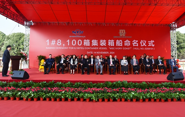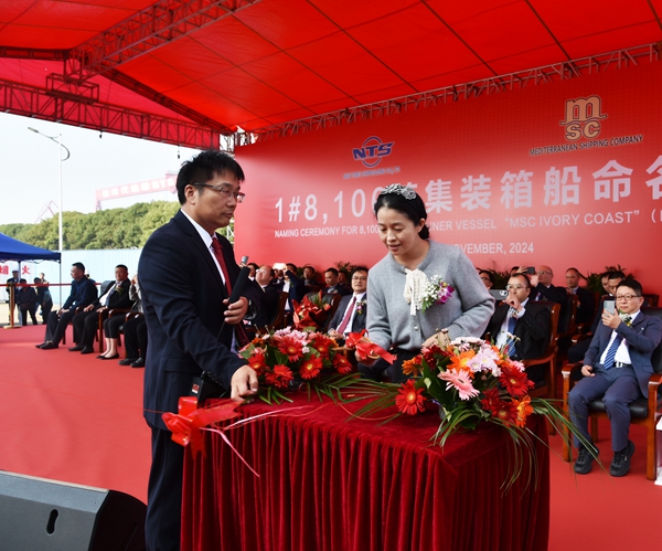 11月14日上午,公司在新區(qū)碼頭隆重舉行船舶命名儀式,1#8100箱雙燃料動力集裝箱船被命名為“MSC IVORY COAST”號。
