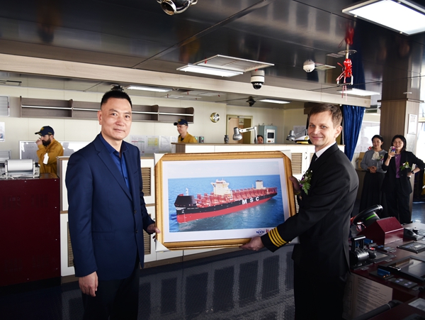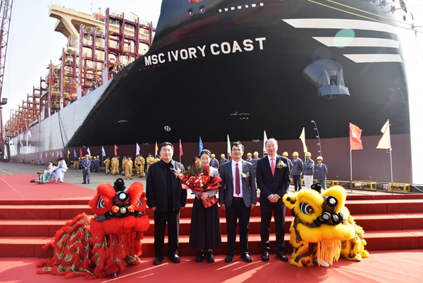 總經(jīng)理劉海金、常務(wù)副總經(jīng)理張玉永、副總經(jīng)理袁衡與船東MSC中國區(qū)經(jīng)理G.Gargiulo、MSC上海辦公室高級營運經(jīng)理Ye Yun、現(xiàn)場經(jīng)理陳玉坤、教母劉姣、LR船級社代表等嘉賓出席活動。