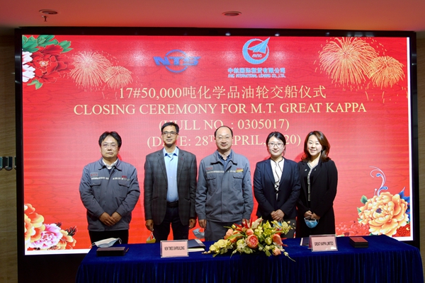 4月29日下午,公司舉行17#50000噸化學(xué)品/油船交付儀式,公司總經(jīng)理劉海金、常務(wù)副總經(jīng)理張玉永與船東中航國際租賃有限公司代表等嘉賓共同出席活動。在友好的氣氛中,常務(wù)副總經(jīng)理張玉永與17#50000噸化學(xué)品/油船中航國際租賃有限公司的代表共同簽署交船文本,該船正式交付中航國際租賃有限公司運營。隨后,17#50000噸化學(xué)品/油船駛離公司碼頭,開始了遠(yuǎn)航。