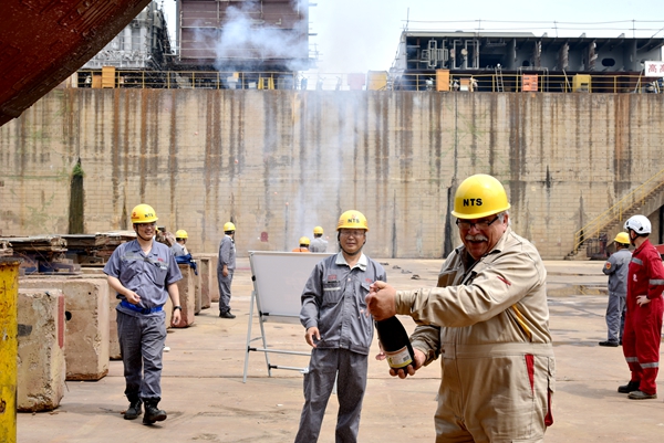 5月26日上午,公司在2#塢區(qū)域舉行船舶進(jìn)塢合攏儀式,2#13000箱集裝箱船的船體結(jié)構(gòu)進(jìn)塢合攏正式開始。
