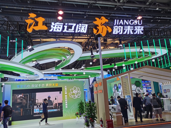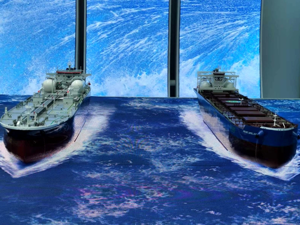 在江蘇館展區(qū),展品既有硬核的工業(yè)產(chǎn)品,也有日常的生活用品,均透露出了濃濃的科技范兒。公司11.1萬噸雙燃料動力油船模型和21萬噸雙燃料動力散貨船模型參展,船模置于虛擬海洋桌面,佐以“乘風破浪”特效,吸引了不少參觀者駐足流連。