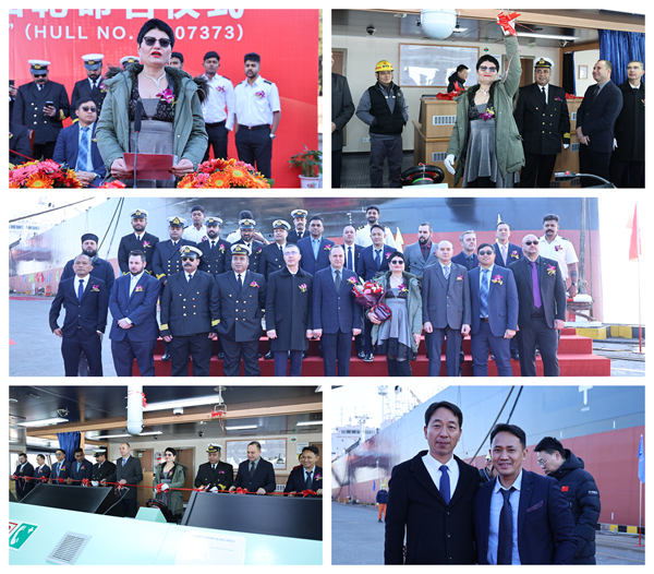 3日上午,新區(qū)碼頭洋溢著莊重喜慶的氣氛,公司為希臘船東Dynacom精心建造的73#73500噸油船命名儀式隆重舉行,揭開了新年船舶命名交付的新篇章。常務(wù)副總經(jīng)理張玉永主持儀式,在船東代表、船級社代表、駐廠監(jiān)造師及公司員工代表的共同見證下,教母Mrs. Florentina Mustata為巨輪賜福命名:“我將你命名為‘PETROKARAVO’號,愿你在未來的航程中,永遠(yuǎn)與平安相伴,與繁榮同行!”話音落下,Mrs. Florentina Mustata手持金剪,優(yōu)雅地剪斷了系于船頭的象征吉祥的紅色綢帶。頃刻間,巨大的紅色帷幕如瀑布般滑落,“PETROKARAVO”船名赫然呈現(xiàn);與此同時(shí),象征好運(yùn)的香檳也應(yīng)聲砸碎在船頭,金色酒液激烈四濺,寓意著新船未來航程必將滿載榮耀。繽紛的彩色禮花在船艏上空綻放,碼頭邊鞭炮齊鳴,將現(xiàn)場熱烈氣氛推向頂點(diǎn)。儀式結(jié)束后,嘉賓們移步至船舶駕駛室,在簡潔而莊重的氛圍中共同剪彩,這艘現(xiàn)代化油船的“智慧中樞”正式啟用。圣母、船長等嘉賓拉響汽笛,一聲聲雄渾悠長的笛聲劃破長空,宣告“PETROKARAVO”號油船蓄勢待發(fā)。