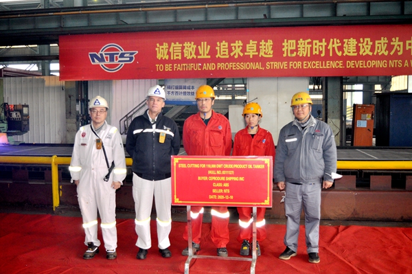 9:30,首先進行的是27#110000噸原油輪/成品油輪開工儀式。公司生產(chǎn)管理部陳月鋒部長與 EPS船東代表、ABS船級社代表共同出席開工儀式。此次開工建造是船東EPS公司訂制的4艘110000噸油輪系列船中的第三艘。該系列船舶船長249米,型寬44米,型深21.3米,設(shè)計吃水13.5米,結(jié)構(gòu)吃水15米,艙容128990立方米,載重量為110200噸。