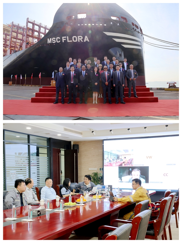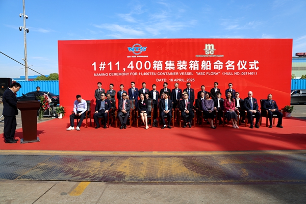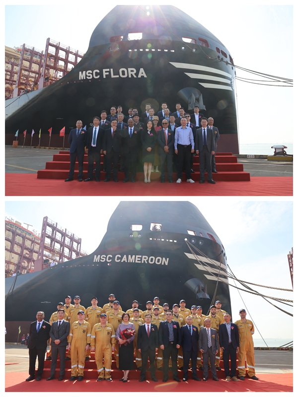 4月16日上午,公司舉行船舶命名儀式,1#11400箱、3#9#8100箱LNG雙燃料動力集裝箱船被分別命名為“MSC FLORA”“MSC  CAMEROON”“MSC  NAMIBIA”號。