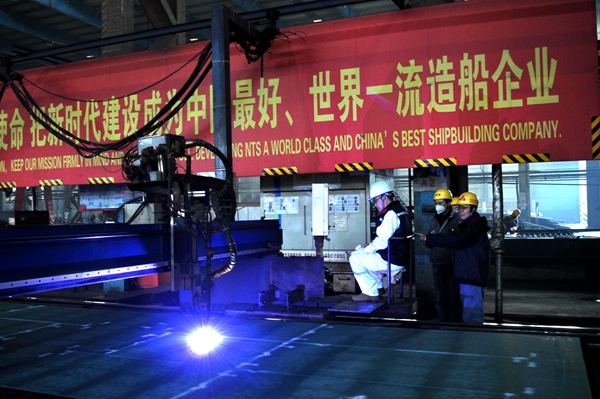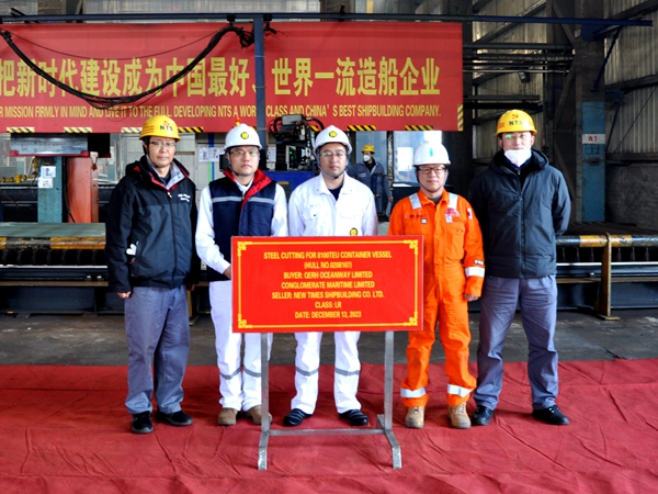 12月13日上午,公司在東區(qū)鋼加車間三跨舉行船舶開工點火儀式,7#8100箱雙燃料動力集裝箱船的船體結(jié)構(gòu)件開始預制。生產(chǎn)管理部等相關(guān)部門負責人與船東CONGLOMERATE MARITIME LIMITED代表出席活動。