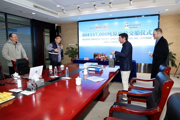 3月17日上午,公司舉行船舶簽字交付儀式,總經理劉海金、常務副總經理張玉永與希臘船東Polembros Shipping Limited代表出席活動,共同見證船舶簽字交付。