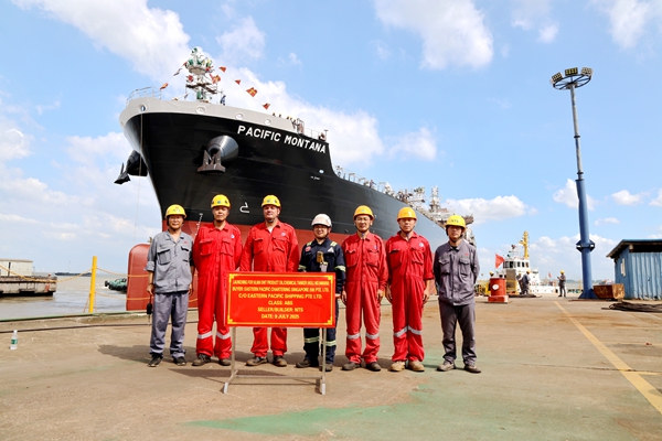 7月8日、9日下午,56#115000噸油船、58#50000噸Ⅱ類(lèi)化學(xué)品船分別在海事拖輪的牽引下駛出1#塢,下水大節(jié)點(diǎn)目標(biāo)順利實(shí)現(xiàn)。