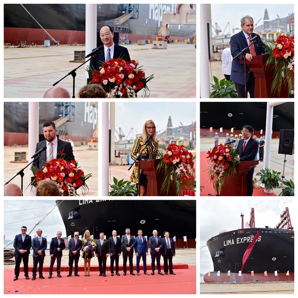 9月6日中午,1#13000箱集裝箱船命名儀式在浙江舟山金海船廠碼頭隆重舉行,公司總經(jīng)理劉海金、常務(wù)副總經(jīng)理張玉永、教母PAILLETTE PALAIOLOGOU女士(法國船級(jí)社東南歐、黑海及亞德里亞區(qū)副總裁)、船東Chartworld航運(yùn)公司總經(jīng)理ANTONIOS FARAKLAS先生、赫伯羅特公司漢堡董事CASTILLO ORLANDO先生,法國船級(jí)社新造船部中國區(qū)經(jīng)理VAES CHRISTOPHE先生等嘉賓出席活動(dòng)。